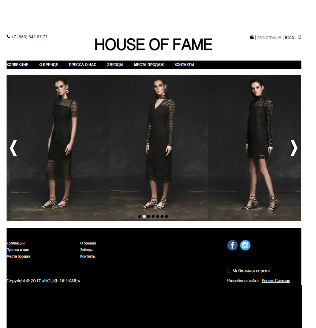В 2016 году наша компания выполнила работы по созданию дизайна и функциональности веб-сайта, а также его мобильной версии, для интернет-магазина House of fame - российского бренда женской одежды, главная идея которого - создание универсального коктейльного платья «на выход».